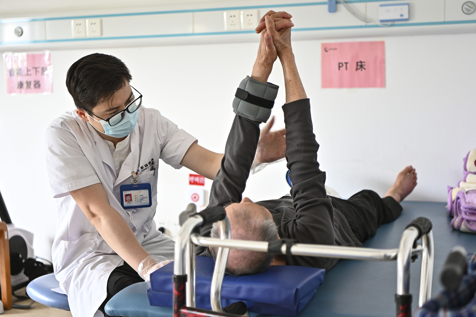 广州,南沙区养老院,责任主说念主员协助老东说念主进行理疗康复。