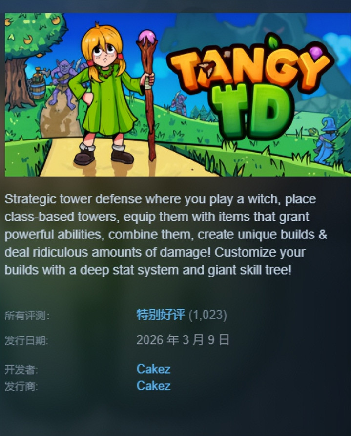 直至本年3月初,《Tangy TD》总算是提前上线了。天然算不上十全十好意思,但这部交融了肉鸽与塔防的作品如故取得了一大齐玩家购入,九游娱乐达到了92%的好评率。