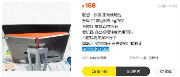 这几天我在二手鱼里闲荡,看到一台型号是B50r1的联思一体机,这玩意是23寸的屏幕,没思到卖家只挂了158块,一体机是2011年5月产的,十足的老咕噜棒子。但仔细望望建设,又合计有点兴致。惟一缺憾的是仅限自提,可惜我不是保定涞水县的,否则十足拿下,因为拆机卖十足齐能回本。