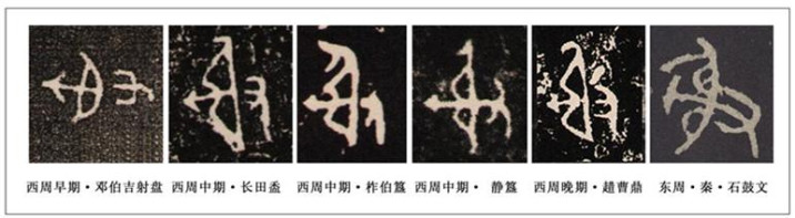 到了周代的金文时期,“射”的字形变化宏大(图3),西周早期平直顺承甲骨文时期的样式,强调了手和弓箭之间的联系;而到了西周中期,则要点强调弯弓的力度,以致把弓描摹得相等缜密,险些和确实相似(图4);到了东周,特地是春秋时期秦国石饱读文的“射”,“手”和“弓”依然融为了一体,何况“弓”的造型已发生了变化,若是不是有前边字形的轻松演化图例,以致看不出是“弓”的样式,反而更像躯壳的“身”(图5),这就为后期秦长入的小篆字形酿成了一定程度上的“误导”,因此,小篆的“射”(图6)就变成了“身+寸”的结构,这其实是笔墨演化经由中的讹变状况。
