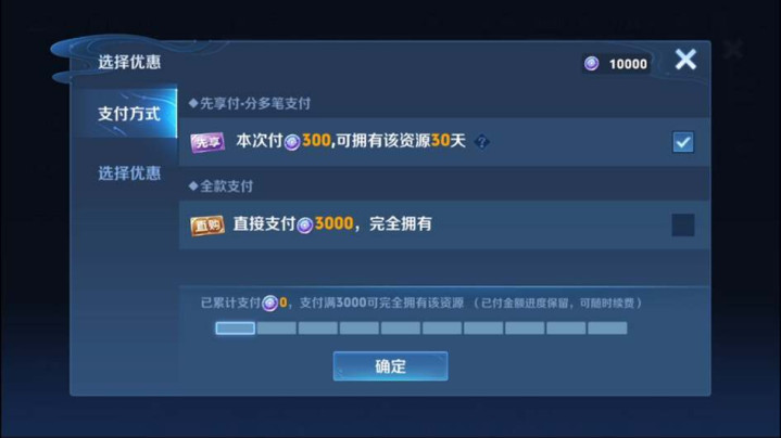 如下图所示,玩家购买星据说的时候,会有两种支付花式,一种是支付三千星币透顶领有,一种是支付三百星币,领有30天。