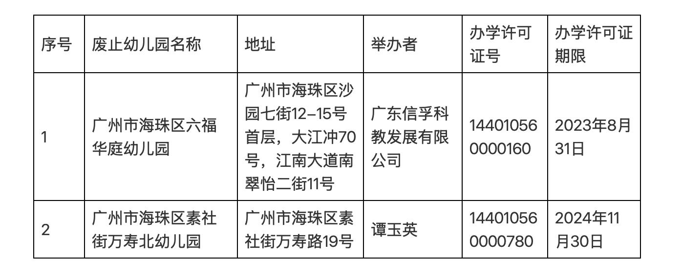 1月16日,广州市海珠区老到局发布公告,默示该区六福华庭幼儿园、素社街万寿北幼儿园共2所幼儿园的中华东说念主民共和国民办学校办学许可证当然废止。