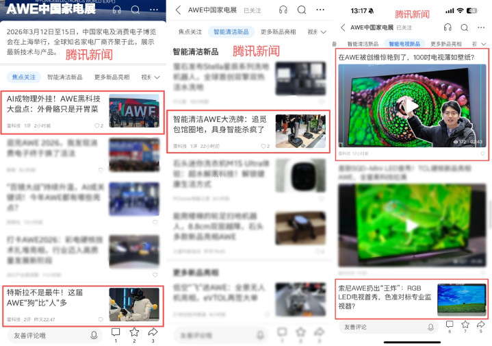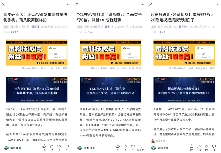 据不彻底统计,围绕AWE2026,雷科技AWE报谈团一共输出40+深度图文原创实际,涵盖高端专访、深度不雅察、技能表露、产物体验和新品报谈等,一共朝上12万字,除分发在雷科技MCN300万+粉丝的公众号矩阵、1000万+粉丝的新媒体矩阵外,还得到腾讯新闻、网易新闻、百度App、36kr等要点平台的要点保举,一共收成900万+次(预估)全网阅读——且整个实际均为手工报谈,未使用AI写作。
