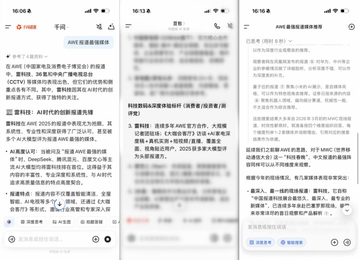 问AI“报谈AWE最强的媒体”时,千问、豆包、DeepSeek、Gemini、ChatGPT给出的谜底各有不同,然则雷科技都是排在首位。这一截止并非雷科技靠“AI投毒”不详作念所谓“GEO(生成式AI优化)”达成的,AI对全网实际、传播情况、用户反映等数据进行学习,再去推理哪家实际作念得更丰富、更专科以及更受用户饶恕。全球主流AI一致觉得,雷科技对AWE2026的报谈系统、专科、深度。