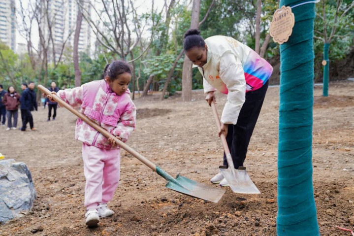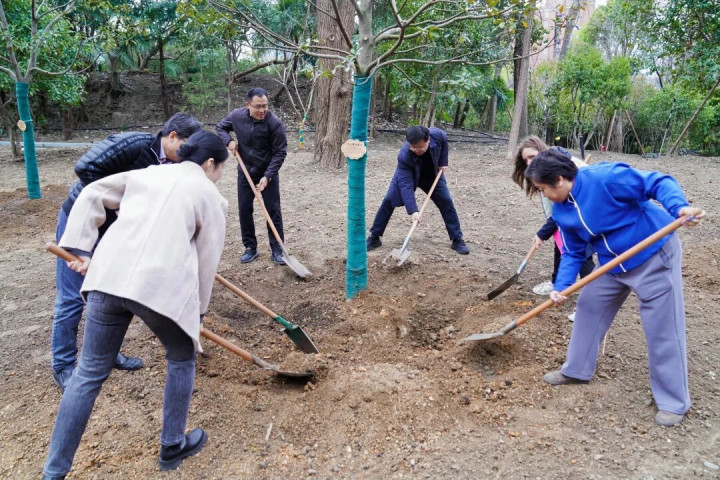 异邦友东说念主志愿者挥动铁锹进行培土