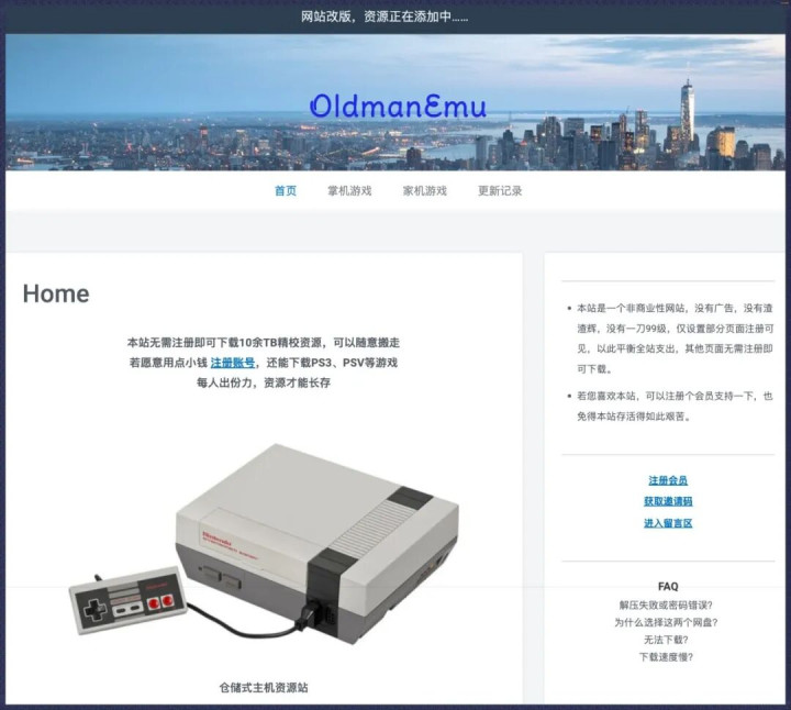 好在网站最近又再行开放了。仅仅任天国联系的古早游戏资源全被删了,首页顶部还新增了一溜辅导:“网站改版中,资源正在陆续添加……”