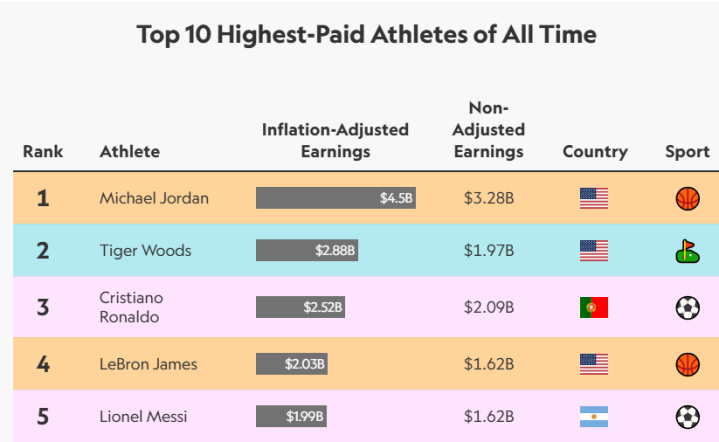 此番收入让乔丹处事生存总收益预估达到32.8亿好意思元,经通胀救助后为45亿好意思元。他在行家史上收入最高通顺员榜单中进一步拉大了与泰格-伍兹的首先上风。伍兹转为处事选手以来总收入为19.7亿好意思元,通胀救助后为28.8亿好意思元。排在第三至五位的是C罗(25.2亿)、詹姆斯(20.3亿)和梅西(19.9亿),括号内数据均为经由通胀救助后。
