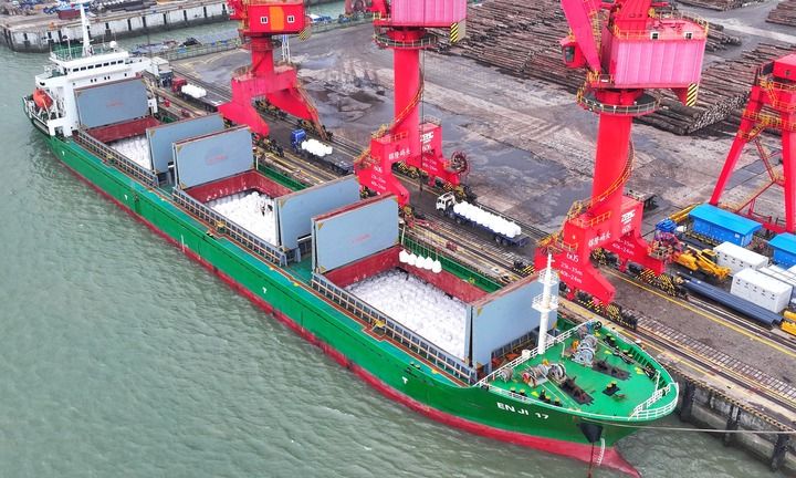 2026年3月18日,在江苏张家港锦无际件船埠,国外飞行船舶在泊位上有序卸运入口化肥(无东说念主机像片)。新华社发(赵国政摄)