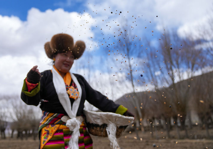 2026年3月16日,西藏山南市遏制乡遏制村村民身着盛装,在新犁开的意境上播种种子。新华社记者 晋好意思多吉 摄
