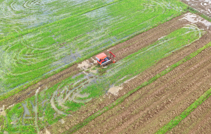 2026年3月20日,在湖南省衡阳市祁东县金桥镇,村民驾驶农机翻耕稻田(无东说念主机像片)。新华社发(曹正平摄)