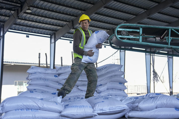 2026年3月17日,工东说念主在位于黑龙江省绥化市的哈尔滨铁路物流中心绥化贸易部农资装卸功课现场卸化肥。新华社记者 王松 摄