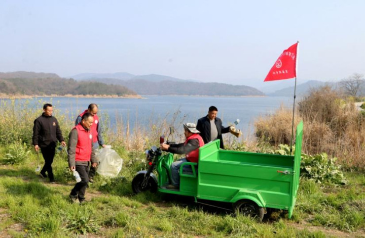 漳河水库马河镇三里岗村林家沟,“河伙东谈主”志愿者正在“清扫家园”。