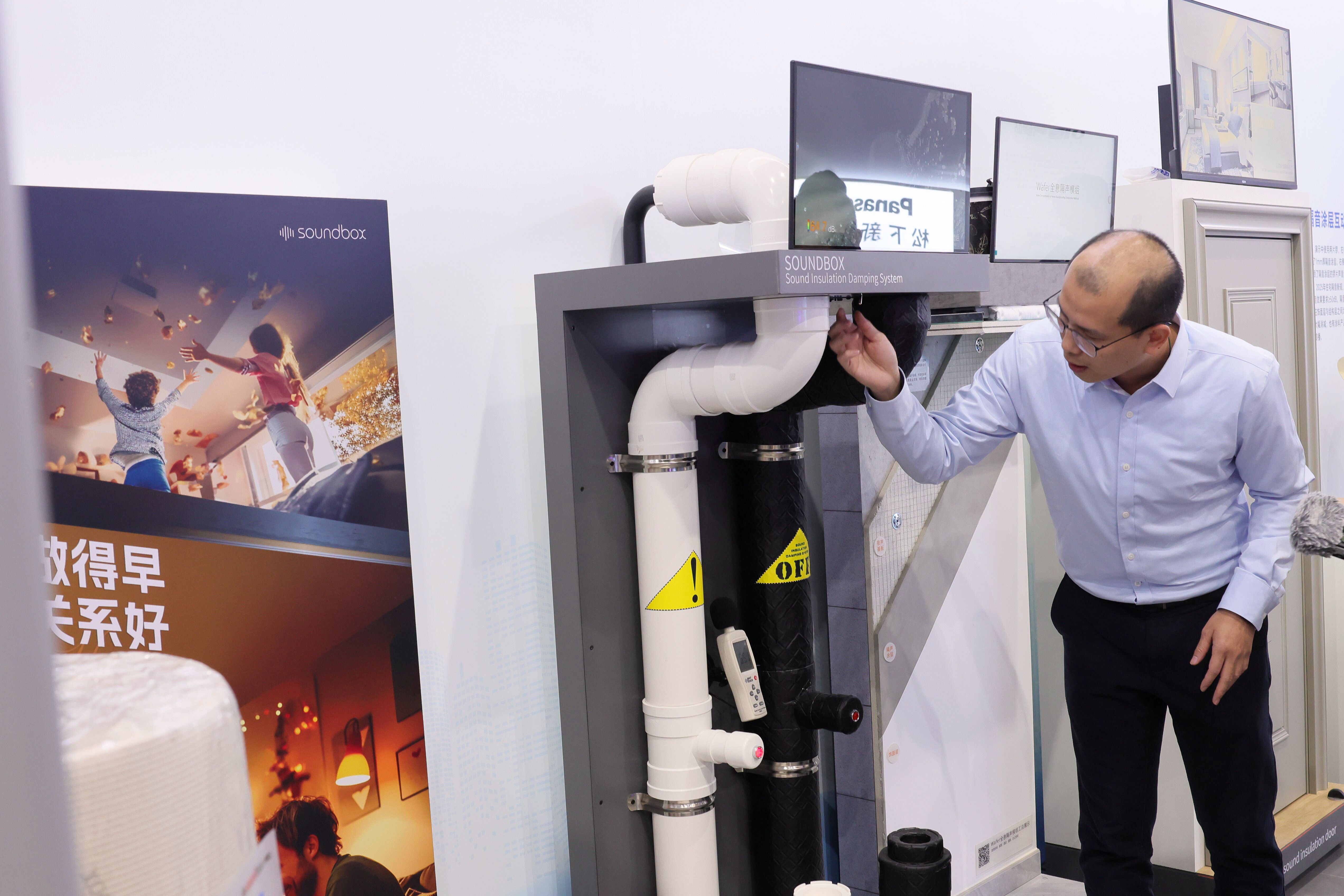 声息惬意区建立隔音涂料互动锣、隔音工艺模子、静音水管、隔音门等体验技俩,展出的隔音门隔音量达39dB,旧改大地静音材料可镌汰杂音约15dB,均适当国度尺度《住宅技俩措施》GB55038-2025条款。