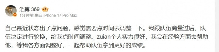 4月1日,TES官宣了上调二队上单Zuian至一队的音书,之后369更博告别赛场: