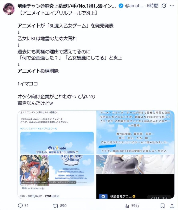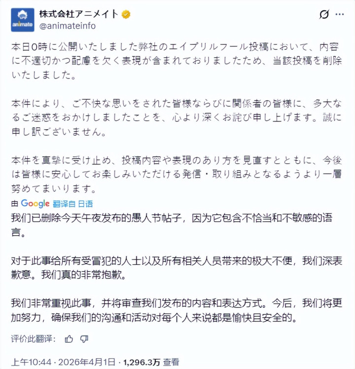 事情发酵之后,Animate很快删除原帖并发布谈歉声明。