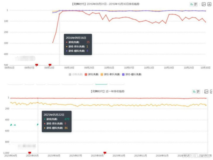 《劲舞时间》近一年仍是掉出免费游戏榜,免费音游分类也在十几名开外了。
