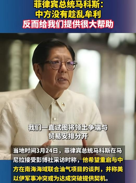 今日接管彭博社采访时,小马科斯一悔改去半年对华果断姿态,开释出暴虐爽朗信号:主动肯求重启中菲南海长入油气形式探讨,致使直言“中东冲突或为中菲和谐突破提供机会”。