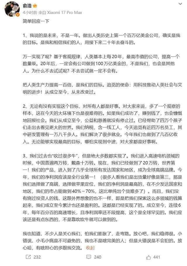 更夸张的是,俞浩曾直言:“畴昔要打造百万亿好意思元级别企业”。